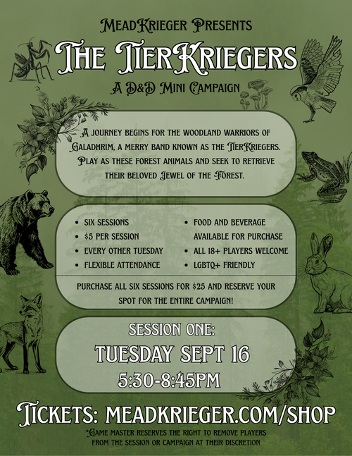 Back Patio D&D Mini Campaign- Sold Out! Tuesday, September 16, 2025 5:30 PM 8:45 PM 17:30 20:45 MeadKrieger Meadery 452 North Washington Avenue Loveland, CO, 80537 United States (map) Google Calendar ICS SOLD OUT!EMAIL MATT AT MEADKRIEGER@GMAIL.COM TO GET UPDATES ON OUR NEXT MNI-CAMPAIGN