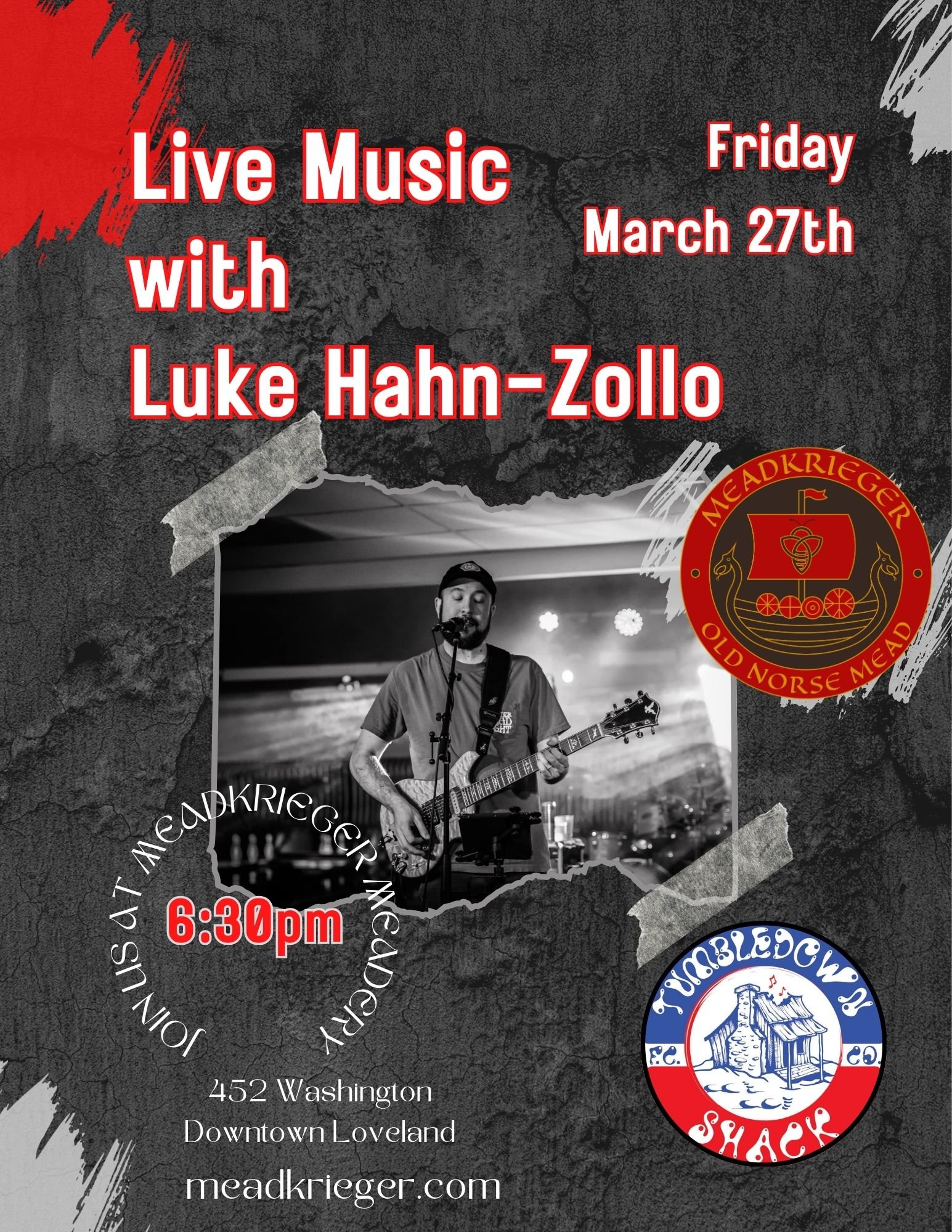 Live Music with Luke Hahn-Zollo from Tumbledown Shack Friday, March 27, 2026 6:30 PM 8:30 PM 18:30 20:30 MeadKrieger Meadery 452 North Washington Avenue Loveland, CO, 80537 United States (map) Google Calendar ICS Enjoy an evening of live music with Luke Hahn‑Zollo, founding member, guitarist, and vocalist of Northern Colorado’s beloved Grateful Dead tribute band, Tumbledown Shack.