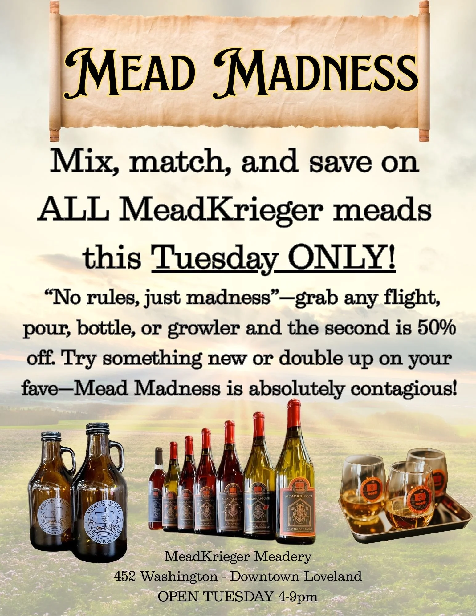 “No rules, just madness”—grab any flight, pour, bottle, or growler and the second is 50% off. Try something new or double up on your fave—Mead Madness is absolutely contagious!