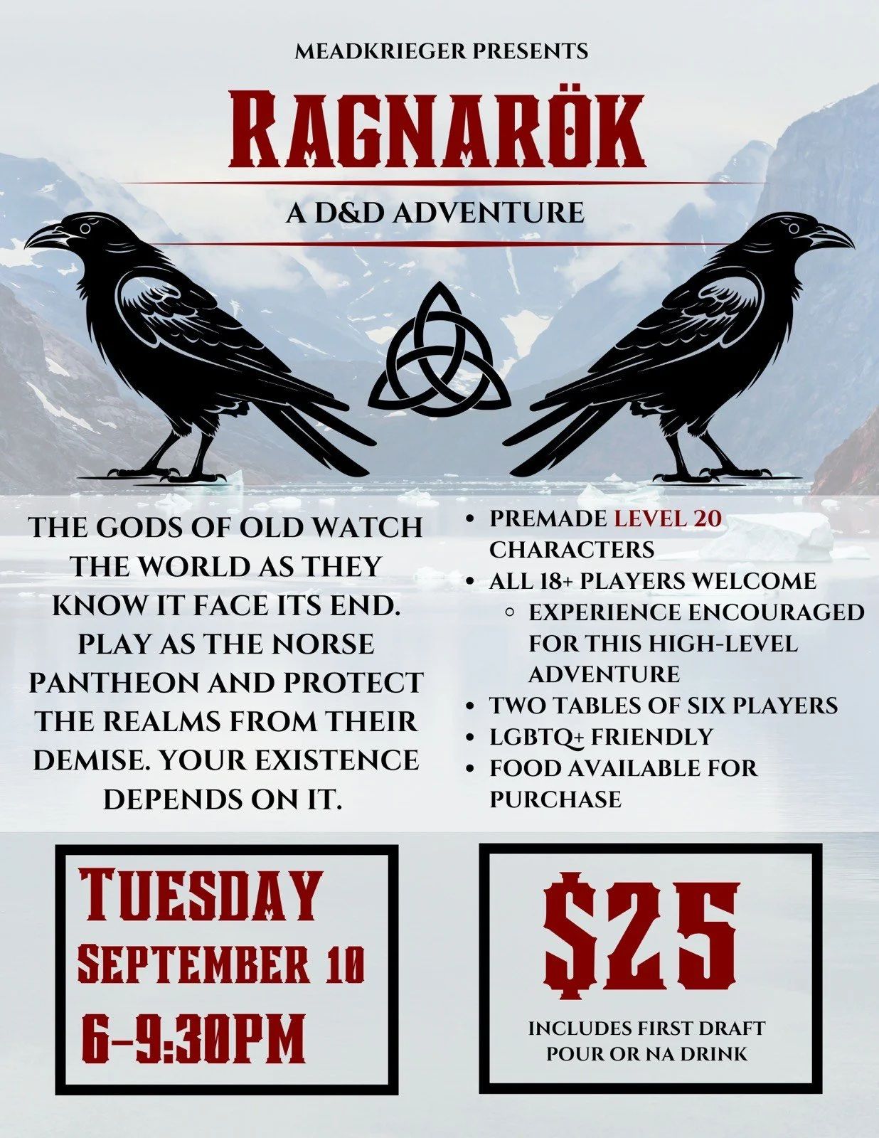 Monthly D & D Game Tuesday, September 10, 2024 6:00 PM 9:30 PM 18:00 21:30 MeadKrieger Meadery 452 North Washington Avenue Loveland, CO, 80537 United States (map) Google Calendar ICS Our popular D & D Night… Also Stay tuned for our October night