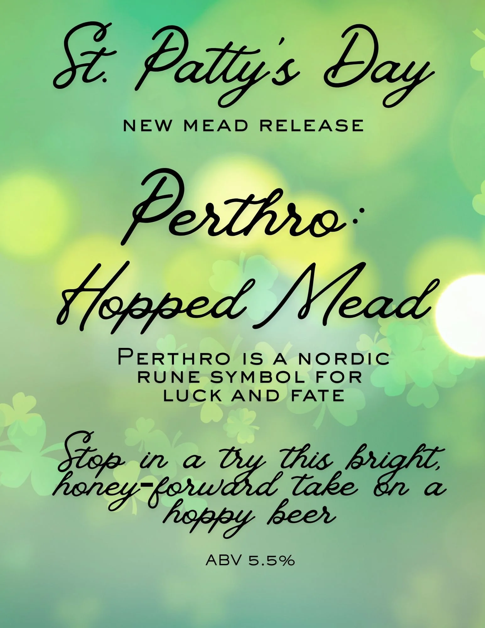 New Mead Release - Perthro: Hopped Mead Sunday, March 15, 2026 12:00 PM 6:00 PM 12:00 18:00 MeadKrieger Meadery 452 North Washington Avenue Loveland, CO, 80537 United States (map) Google Calendar ICS Stop in today and try Perthro, our bright, honey‑forward hopped mead named for a Norse rune of luck and fate—raise your horn and let fate decide your new favorite pour! Skol!